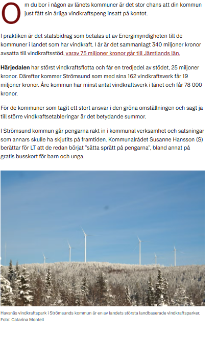 - Att visa vad ni tänker göra med pengarna ni får för vindkraften är ett smart sätt att visa vad vindkraften ger tillbaks lokalt och få medel till + uppmärksamhet för satsningar (miljö/ekonomi/socialt). Exempel: I Strömsunds kommun går pengarna rakt in i kommunal verksamhet bl.a. till gratis busskort till barn och unga (artikel i Länstidningen Östersund 26/3, se skärmbilder nedan). Hur planerar ni att använda era vindkraftspengar? Berätta för oss (kansliet@klimatkommunerna.se, max.bonnier-eklund@greenpowersweden.se och matilda.killander@greenpowersweden.se så sammanställer vi exemplen och sprider!